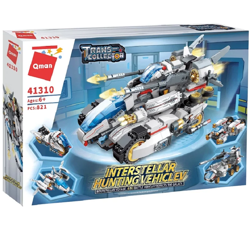 QMAN márkájú, minőségi, Lego kompatibilis építőjáték, egy szuper 4 az 1-ben űrjármű. A 4 jármű külön-külön is 2 az 1-ben funkcionál. Egyben pedig egy fantasztikus csillagközi vadászt tudsz belőlük összeépíteni. Az építőjáték összesen 821 db építőkockát tartalmaz.