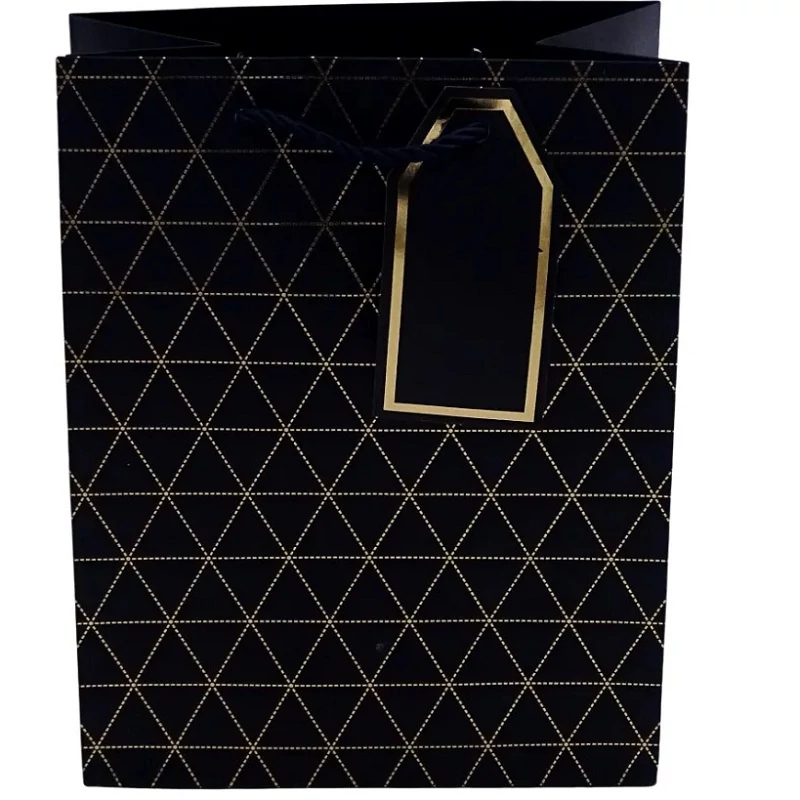 Emeld az ajándékozás színvonalát ezzel a háromszög mintás papírtasakkal, amely a modern elegancia tökéletes megtestesítője! A fekete alapszín és az arany színű geometriai minta egyedi stílust ad, amely bármilyen alkalmat különlegessé tesz. Legyen szó születésnapról, névnapról, évfordulóról vagy akár céges ajándékozásról, ez a tasak minden helyzetben megállja a helyét.