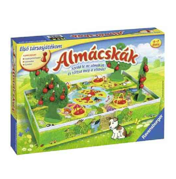 A Ravensburger minden termékét a legjobb minőségben dobja piacra, ahogyan most is. A játékgyártó gondolt az óvodásokra, így elkészítette az Almácskák nevezetű társasjátékot, amellyel való játék csupa móka és kacagás lesz a kicsik számára. A társasjáték kiváló kezdésnek, hiszen fejleszti a szabályértelmezést, a számolást, és az észlelés képességét is. Megértek az almák, itt az idő, hogy a gyerkőcök leszüreteljék. Az nyeri meg a játékot, aki elsőként szedi le az ínycsiklandó almákat a fáról, és gyűjti azokat a vödörbe. A gyerekeknek résen kell lenniük, mert ha hagyják magukat elcsábulni az édességek láttán, hoppon maradnak.