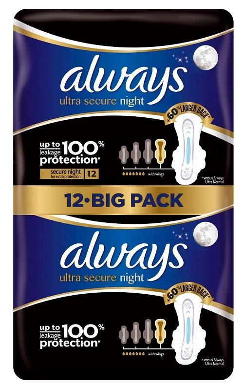 A hátul meghosszabbított Always Ultra éjszakai egészségügyi betétek kiemelkedően magas szintű nedvszívó képességet, extra fedést nyújtanak alvás közben. Különleges fedőrétege a korábbiaknál nagyobb méretű lyukakkal bír, így minden eddiginél gyorsabban szívja magába a nedvességet. A nap különböző szakaszaiban különböző védelemre van szükségünk. A kifejezetten az éjszakai védelemhez tervezett Always Ultra Secure Night betétek 60%-kal* megtoldott hátsó részüknek köszönhetően extra éjszakai védelmet nyújtanak. Ez a védelem még inkább óv a szivárgásokkal szemben, még az éjjeli forgolódások során is. Az Always Ultra betétek a nedvességet magukba záró zselét tartalmaznak, ami nem képes a szivárgásra. Szagsemlegesítő technológiájuk nem csupán elfedi, de meg is gátolja a szagok kialakulását. Az Always Ultra betétek 3mm vékonyak, mégis akár 100%-os szivárgás elleni védelmet és kényelmes érzést biztosítanak. A szárnyak a helyükön tartják a betétet és az Always legkiválóbb védelmét nyújtják a menstruációs szivárgások ellen.