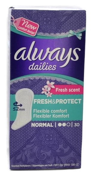 Az Always Dailies Fresh & Protect Normal Fresh tisztasági betét ideális a hüvelyi folyásokhoz, vagy fokozott védelemként a rendszertelen vérzések idejére. Hajlékony és megbízható, szagsemlegesítő technológiája egész napon át segít a frissesség és a komfortérzet megőrzésében. Nedvességfelszívó magja megnyugtató biztonságot nyújt. Az Always Dailies Fresh & Protect Normal Fresh tisztasági betéttel egész nap olyan friss és üde maradhat, akár egy százszorszép! Gondos kialakításának köszönhetően kényelmet és biztonságot ad, így minden nap számíthat rá anélkül, hogy viselete miatt kellene aggódnia!