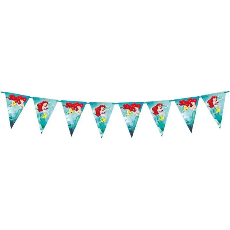 Varázsold igazi tengeri mesevilággá a gyerekzsúrt az Ariel, a kis hableány party zászlófüzérrel! Ez a 230 cm hosszú, vidám, háromszög alakú zászlócskákból álló füzér tökéletes választás minden kis hercegnő ünneplésére. A zászlókon Ariel és hűséges barátja, Flounder szerepelnek, a kékes-tengerzöld háttér pedig igazán friss, víz alatti hangulatot kölcsönöz a dekorációnak.