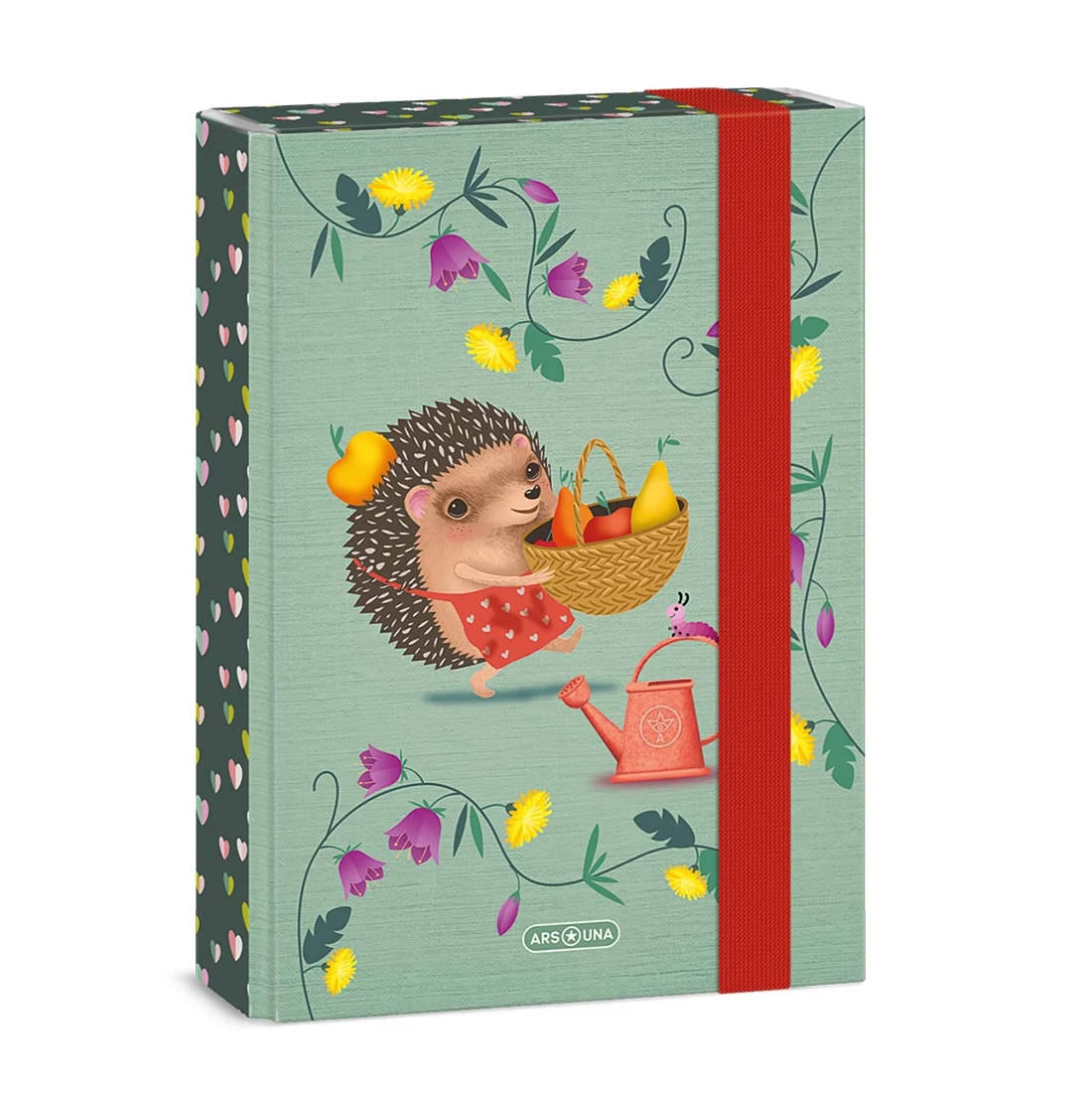Ismerd meg ezt a bájos A5-ös méretű füzetboxot, amely egy vidám süni figurájával és frissítő zöld alapszínnel tölti meg a tanulás óráit. A süni, miközben kosarát gyümölccsel tölti, a természet közelségét hozza el neked, akár csak a gyengéd, természetes árnyalatok és a kert virágainak illata. A bújócska kedvenc, a süni nemcsak aranyos, de inspiráló is – segíthet, hogy minden nap egy kis természeti csoda részese legyél. A piros gumiszalag pedig nem csak a színkavalkádot teszi teljessé, de garantálja a tartalom biztonságát is. Ez a füzetbox tökéletes társ a mindennapokban, ha egy kis színt és örömet szeretnél vinni a tanulásba.