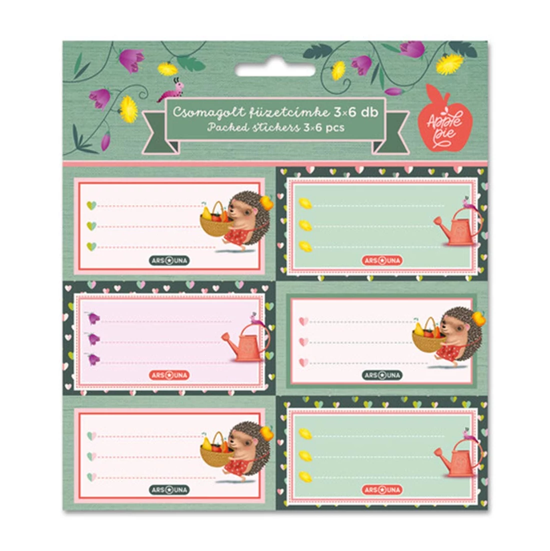 A gyönyörű süni mintás Ars Una füzetcímkék vidám és bájos hangulatot kölcsönöznek minden iskolai füzetnek. A kis sünik alma gyűjtés közben, körülöttük a természet szépségével, azonnal elvarázsolják a gyerekek fantáziáját. A három csomagban összesen 18 füzetcímke található, mindegyik kedves és színes dizájnban pompázik, tökéletes kiegészítő az iskolatáskában. A füzetcímkék kiváló minőségűek, könnyen felhelyezhetők és az öntapadó hátuknak köszönhetően tartósan a helyükön maradnak. Mostantól mindegyik füzeted és könyved pompásan fognak kinézni és mindezt a kis süninek köszönhetően.