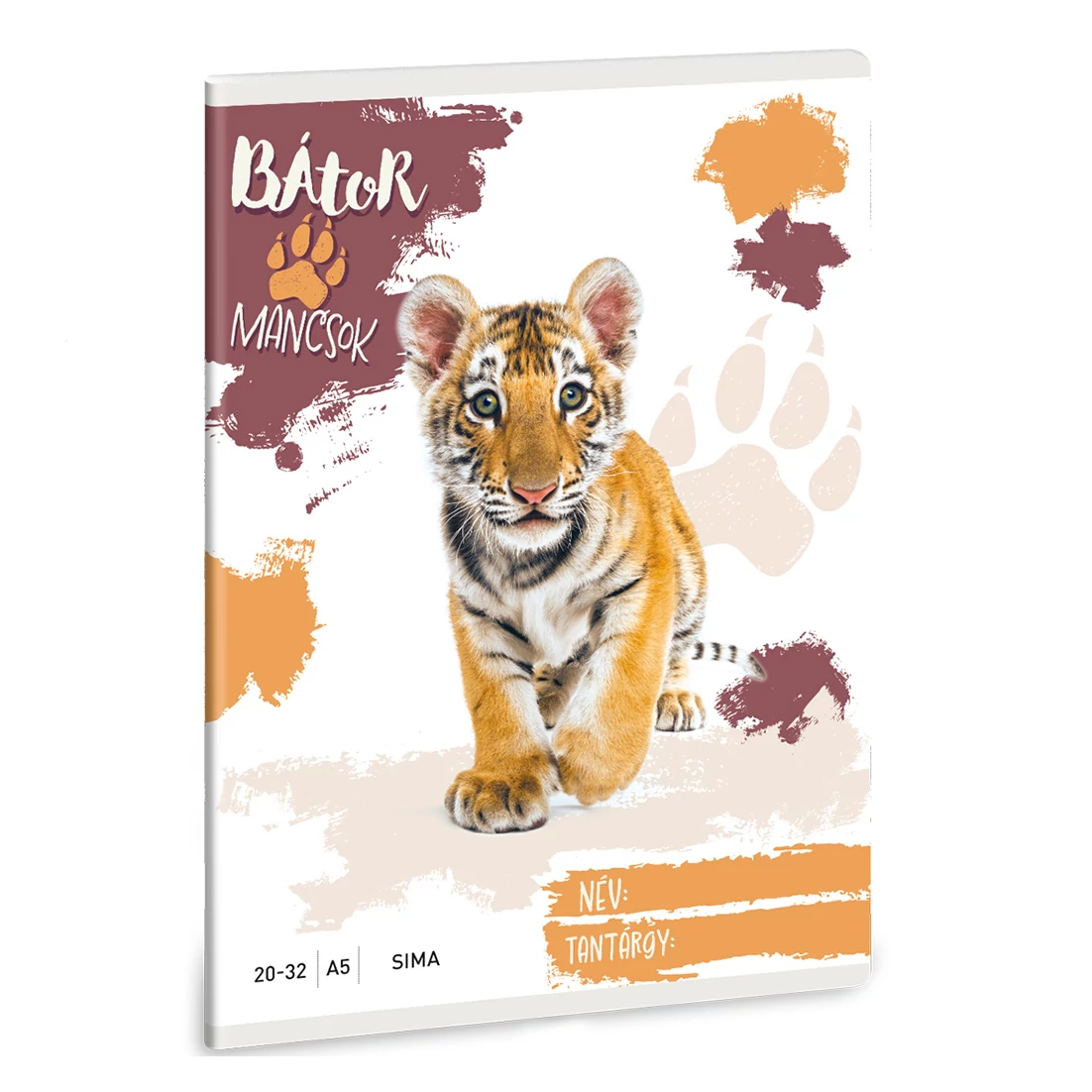 A Bátor Mancsok - Tigris sima füzet A/5 20-32 minden kis felfedező és kalandvágyó iskolás kedvence lehet. A borítón egy aranyos tigriskölyök néz kíváncsian és bátran előre, mintha arra ösztönözné gyermekedet, hogy ő is bátran vágjon bele a tanulásba és az alkotásba. A vidám narancsos, bordós és bézses színfoltok, valamint a nagyméretű mancsnyomok teszik még barátságosabbá és izgalmasabbá a dizájnt. Ez a füzet nemcsak praktikus, hanem inspiráló társ is a mindennapokban.