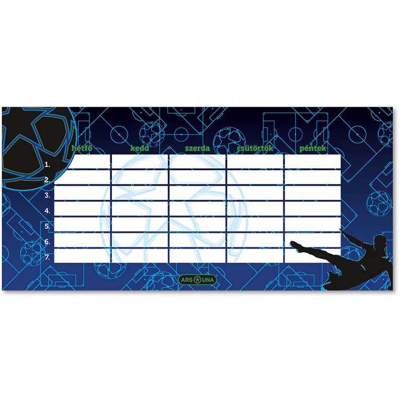 A jól strukturált, 5 napos beosztás 7 tanóráig biztosít átlátható teret, így gyereked mindig képben lehet, milyen órák várnak rá. A strapabíró, minőségi karton biztosítja, hogy egész tanéven át bírja a napi használatot, a dizájn pedig motiváló és lendületes, akárcsak egy jó meccs. Könnyedén behelyezhető füzetboxba, mappába vagy akár a tanulóasztal fölé is kitűzhető.