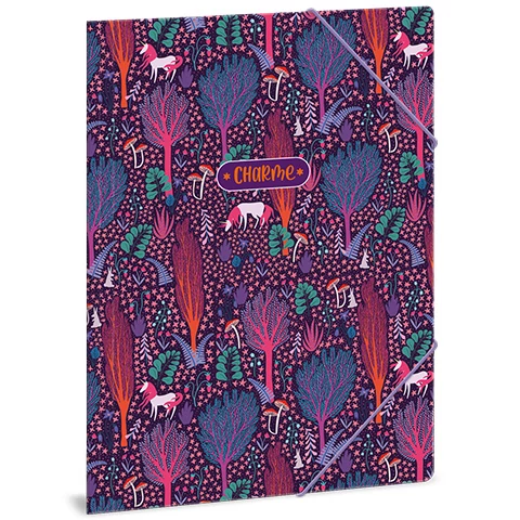 A Charme dosszié első sorban a lányoknak fogja elnyerni a tetszését, hiszen a külső mintát egy varázslatos erdő adja, benne hófehér unikornisokkal. Ezek a mesebeli lények, és a mappa vidám színei még a legunalmasabb iskolai napot is képesek egy kicsit vidámabbá varázsolni. A dosszié az A/4-es méretének köszönhetően minden elterjedt lapmérethez kiválóan használható, a fedlapja egy gumis madzaggal könnyedén fixálható, így biztosak lehetünk abban, hogy a benne elhelyezett lapok és dokumentumok nem fognak összegyűrődni illetve elkallódni.