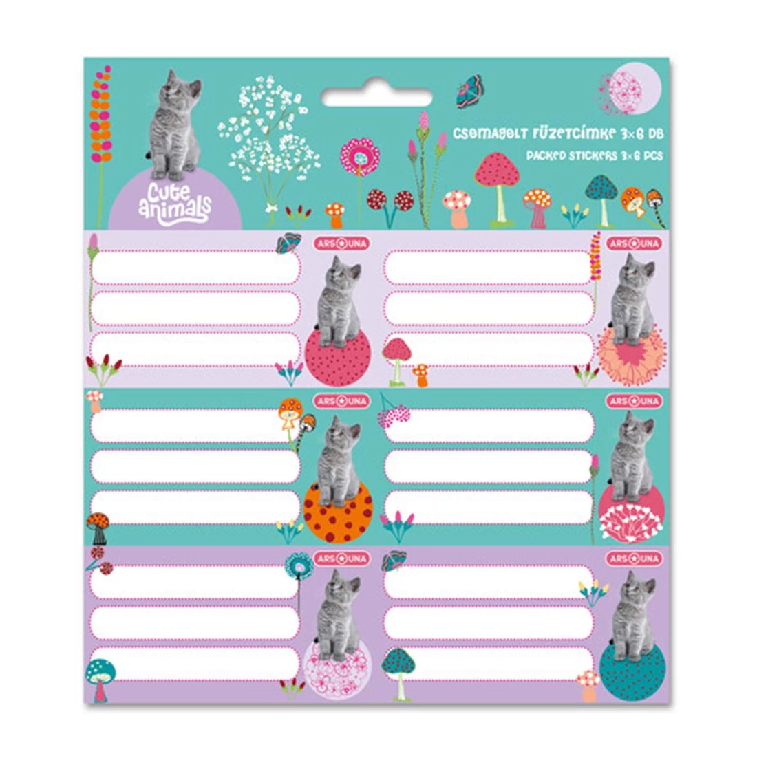 Ars Una: Cuki állatok - Cica mintás csomagolt füzetcímke 3x6db-os