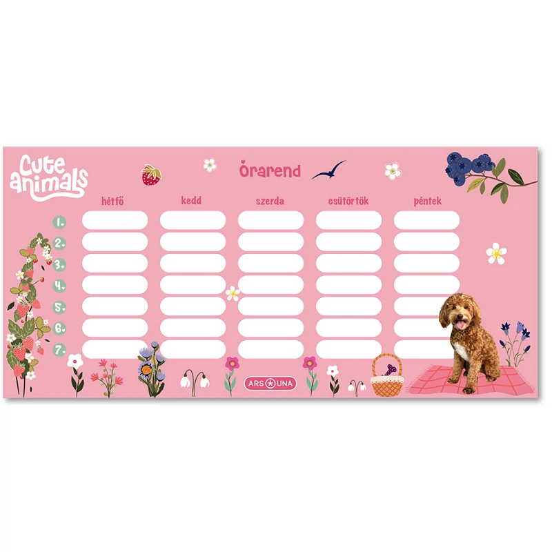 A tanévindítást még vidámabbá varázsolja ez a kedves, kutyás órarend, amelyet kifejezetten az állatokat kedvelő gyerekeknek terveztek. A Cute Animals – Doggie egylapos, kétoldalas órarend rózsaszín hátterével, virágmintáival és egy aranyos, mosolygós kutyus képével nemcsak praktikus, hanem igazi dekorációs darab is a gyerekszobába vagy az iskolai füzettartóba.