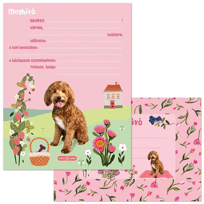 A dizájn igazán barátságos és mesés: a főszereplő egy vidám barna kutyus, aki egy zöld, virágos mezőn ül, a háttérben egy kedves kis házikóval. A meghívó rózsaszín alapszíne és a finom virágminták lágy, barátságos hangulatot teremtenek. A boríték is tökéletesen illeszkedik a meghívó stílusához, virágos mintával díszített, így igazán harmonikus és aranyos összképet alkot.