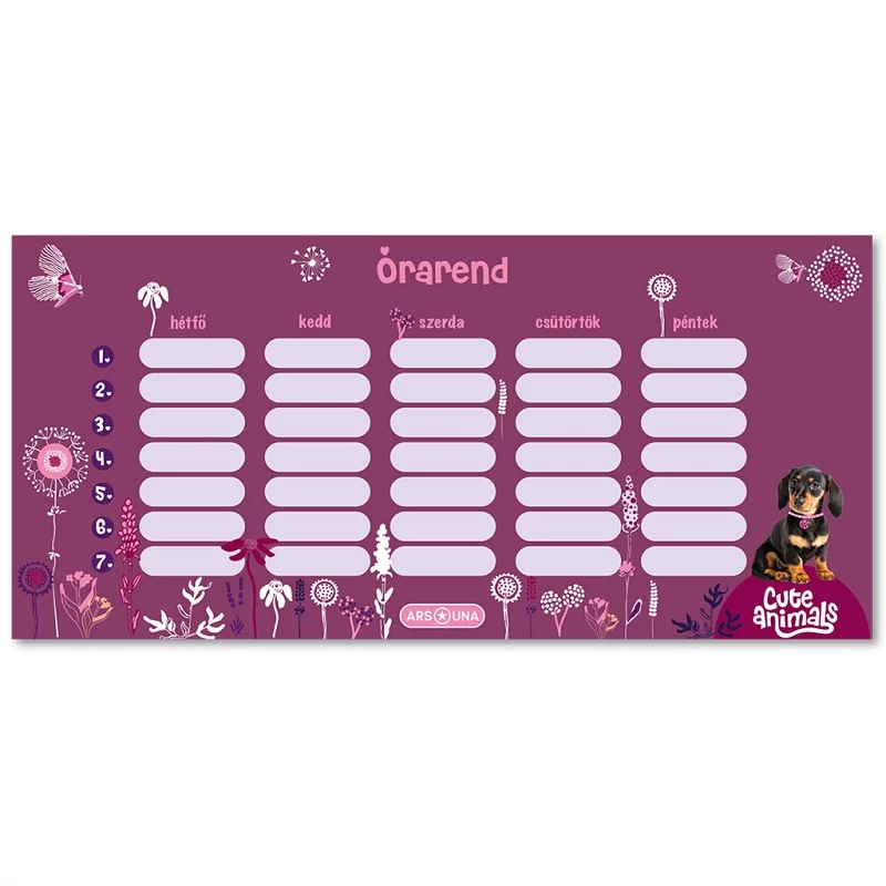 Ismerd meg az Ars Una Cute Animals - Puppy tacskós órarendjét, amely egy igazán kedves és stílusos kiegészítő lesz minden kutyabarát lány számára. Ez az órarend lila alapon tacskós kutyusos és virágos mintájával nemcsak praktikus, hanem aranyos és vidám hangulatot áraszt, amelyet minden napra szeretnél magad körül látni.