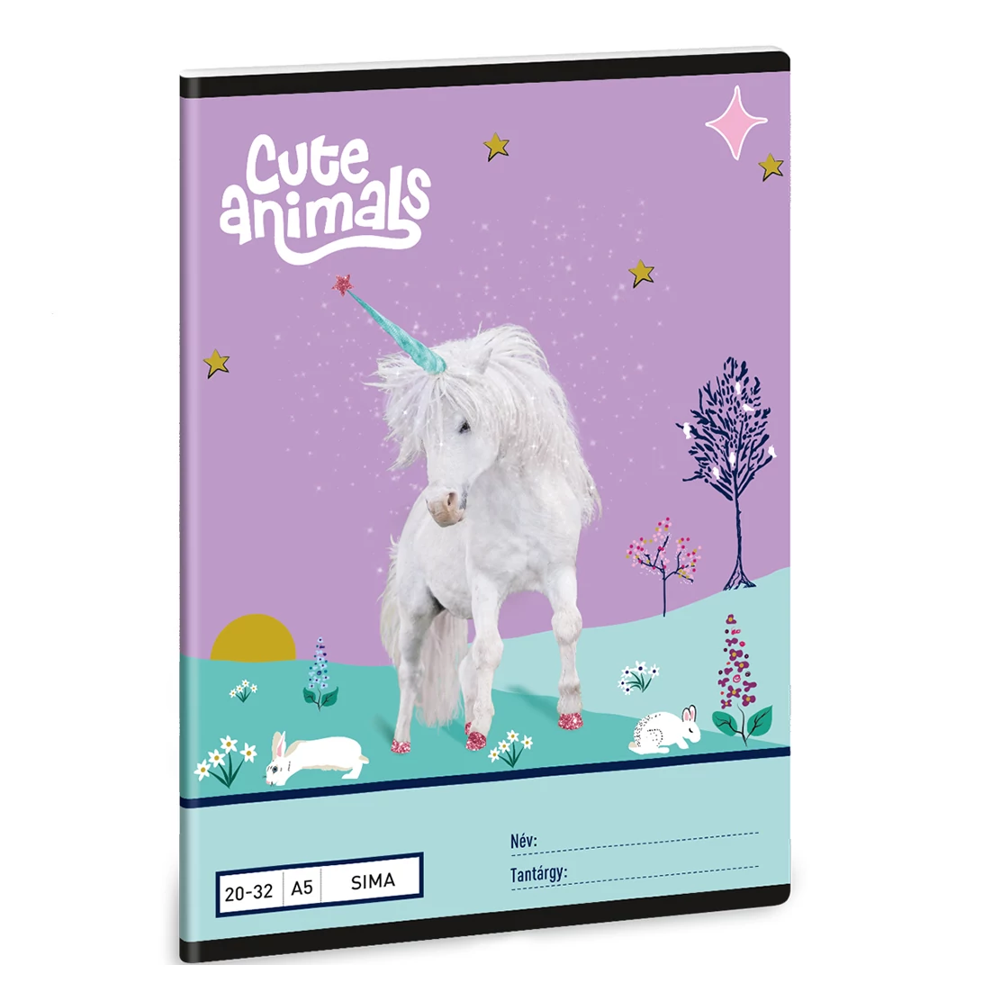 A Cute Animals - Unikornis mintás sima füzet A/5 20-32 egy varázslatos hangulatú iskolai kellék, amely minden kis álmodozó szívét elrabolja. A borítón egy gyönyörű, fehér sörényű unikornis látható, csillogó patákkal és színes szarvval, körülötte csillagokkal, nyuszikával és mesebeli virágokkal díszített tájban. A lila és pasztell árnyalatokban játszó dizájn segít elrepíteni gyermekedet egy fantáziavilágba, ahol az írás és rajzolás igazi élmény lesz.