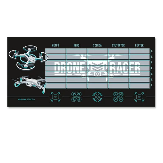 A Drone Racer órarendet a méltán népszerű távirányítós quaderokopterek vagy más néven drónok ihlették, így első sorban a kis srácok tetszését fogja elnyerni, ráadásul a méretét is úgy választották meg, hogy a legtöbb tolltartóban kényelmesen elférjen. A kemény papírból készült órarend tökéletesen alkalmas arra, hogy a tolltartódban emlékeztessen téged a soron következő órákról. Az egyes napokon legfeljebb hét különféle óra jegyezhető fel, de mivel az órarend kétoldalas kialakítást kapott, így A és B hét egyaránt nyomon vezethető rajta.