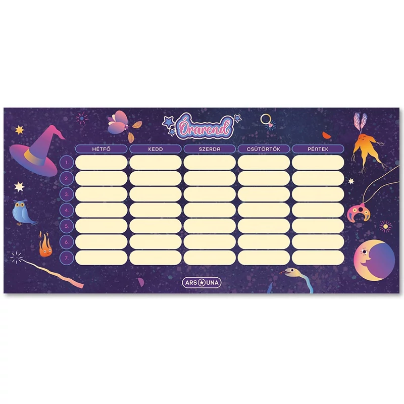 Ismerd meg az Ars Una Enchanted boszis órarendjét, mely egy varázslatos és stílusos kiegészítő minden varázslatos témákat kedvelő lány számára. Ez az órarend sötétlila alapon boszorkányos mintákkal van díszítve, így nemcsak praktikus, hanem misztikus és egyedi hangulatot is áraszt, ami megihlet minden napod során.