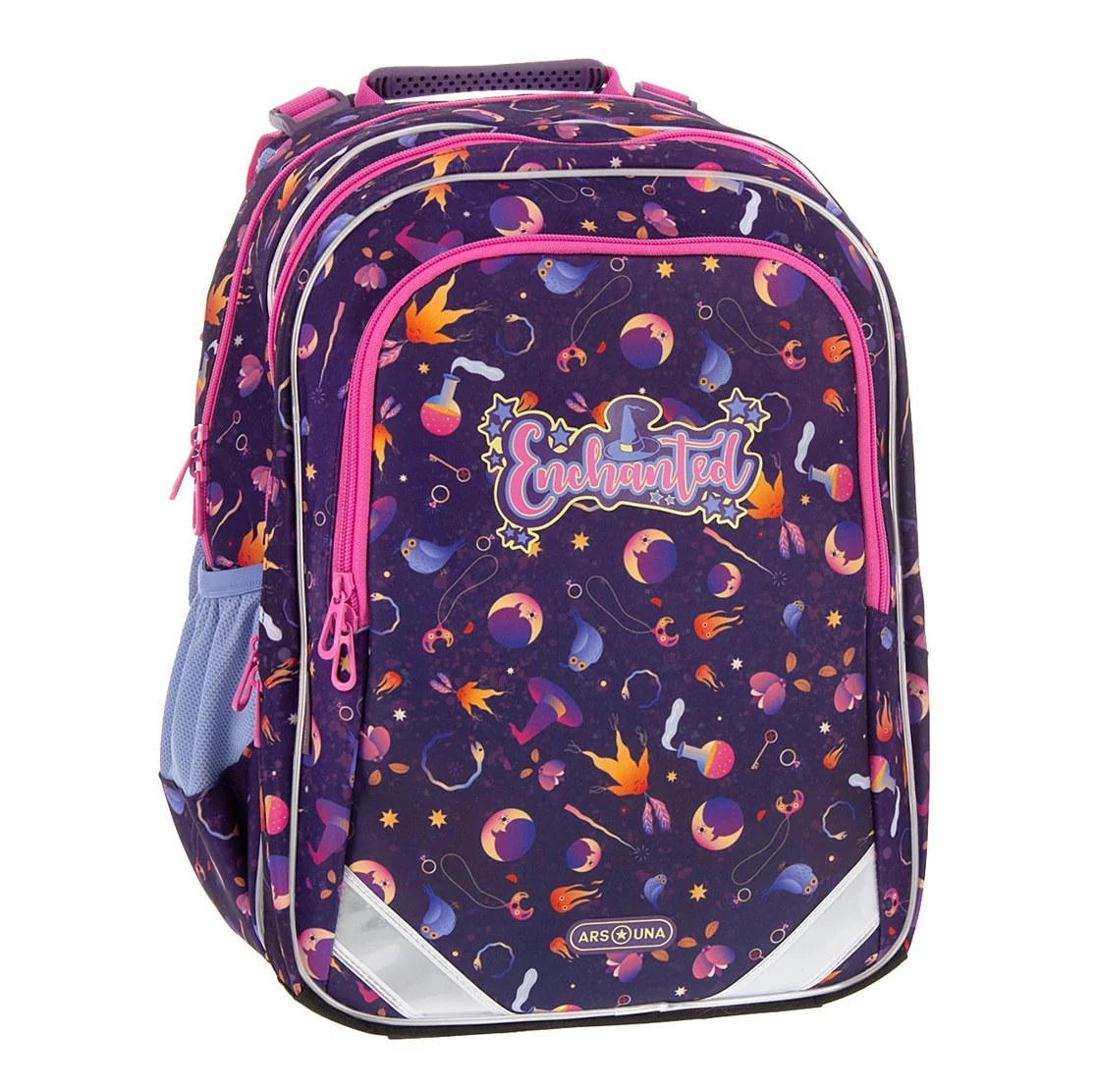 Az ARS UNA ENCHANTED iskolatáska nemcsak praktikus belső elrendezéssel rendelkezik, hanem külseje is figyelemre méltó. Vidám, színes mintái és a nagy felületű fényvisszaverő elemek a biztonságért teszik még vonzóbbá és biztonságossá a gyermek számára.