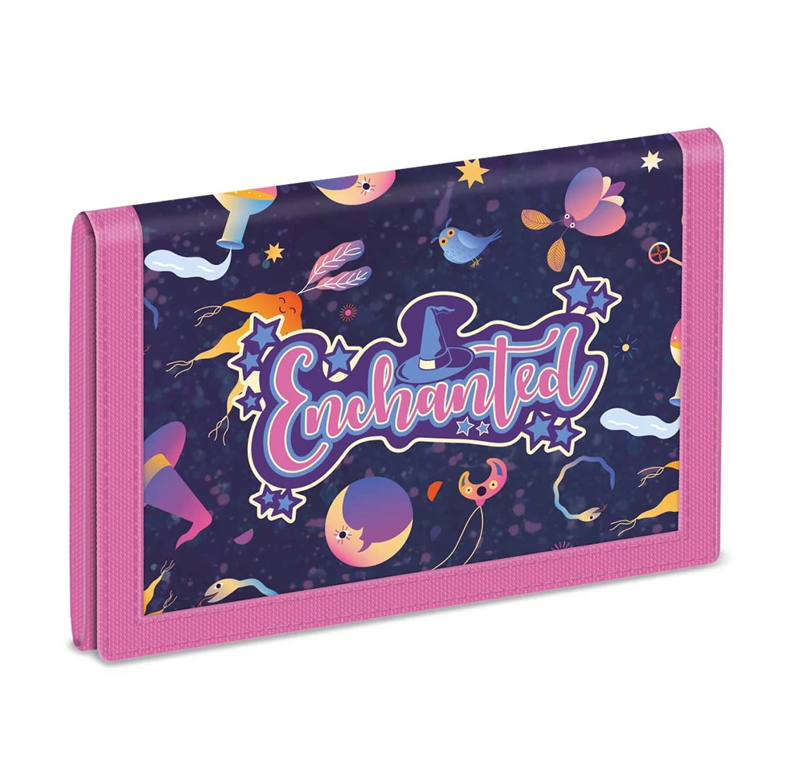Fedezd fel az "Enchanted" pénztárcát az Ars Una-tól, amely varázslatos, éjszakai égboltot idéző dizájnnal hódít. Ez a pénztárca tökéletes választás a kicsiknek, akik szeretik a mesés és varázslatos mintákat. A pénztárca különleges dizájnja egy mágikus világot ábrázol, tele csillagokkal, bűvös tárgyakkal és különféle mesebeli lényekkel, mint például varázspálcák és lebegő szigetek. Az "Enchanted" felirat pedig kiemeli a téma varázslatos hangulatát. A praktikus tépőzárral könnyen nyitható és zárható, biztonságos tárolást nyújtva a pénznek, iratoknak, és egyéb kincseknek. A pénztárca mérete ideális a mindennapos használathoz: kis mérete ellenére elegendő helyet kínál a nélkülözhetetlen tárgyak tárolására.