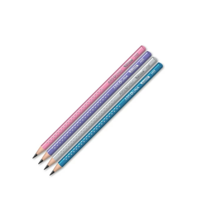 Ezek a különleges, több színváltozatban is elérhető Ars Una prémium grafitceruzák egyaránt elnyerik majd a gyerekek és felnőttek tetszését. A csillag mintával dekorált grafitok kiemelkedő minőségükkel a legmagasabb elvárásoknak is megfelelnek. Az Ars Una prémium minőségű grafitceruzái remekül használhatók az iskolában, otthon vagy akár irodai munkára is. A háromszögletű kialakítás kényelmes fogást biztosít a használat során. A ceruza minőségi faanyagból készült és törésbiztos heggyel lett töltve. A HB hegykeménység a legáltalánosabb, minden célra remekül használható típus.