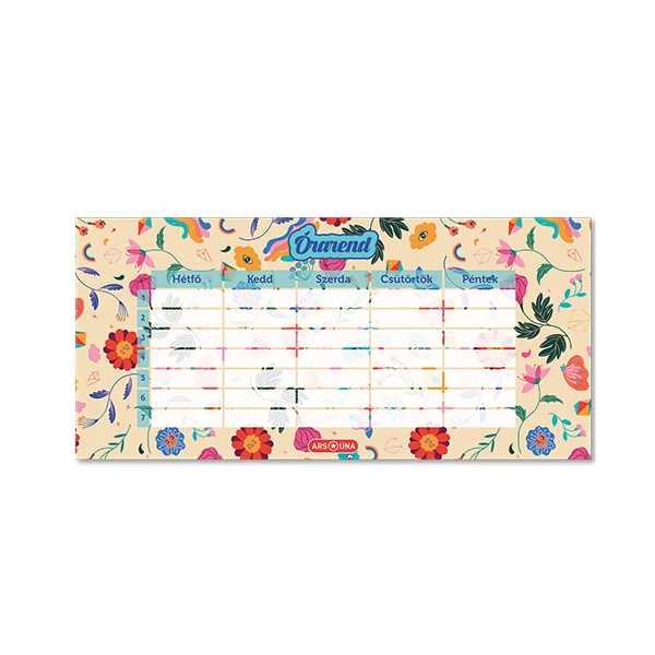 Ahogyan a termék elnevezése is mondja, Flower Power, a virágoknak erejük van. Ez abban rejlik, hogy csodálatos kialakításukkal meggyőzik a kislányokat, hogy az ilyen festésű termékeket válasszák. Egy kislány számára ez az órarend biztosan örömöt fog okozni. Az Ars Una órarend egyetlen lapból áll, de két oldalas kialakítást kapott, így A és B hetet is tudsz rajta jelölni. Az órarend magyar nyelvű, 250g-os félfényes műnyomó papírból van, melynek csodásak a színei és tollal valamint ceruzával is tudsz majd írni rá. Az órarend belefér a legtöbb tolltartóba is, hogy mindig kéznél és szem előtt legyen.