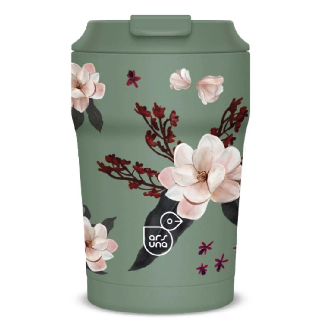 Az Ars Una Flowery Green thermo bögre a természet szépségét és a praktikus mindennapi használhatóságot ötvözi egy elegáns, virágmintás designban. A matt zöld alapon elhelyezkedő finom virágmotívumok letisztult, nyugodt megjelenést biztosítanak, így tökéletes kiegészítője lehet akár egy munkanapnak, akár egy hétvégi sétának vagy utazásnak. A 350 ml-es űrtartalom ideális méret teához, kávéhoz vagy frissítőkhöz, míg a kiváló hőtartás révén akár 6 órán át melegen, vagy 12 órán át hidegen tarthatod benne az italodat.