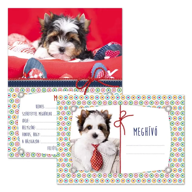 A Kutyás partimeghívó borítékkal – 10 db-os szett szívet melengető módja annak, hogy gyermeked stílusosan és szeretettel hívja meg barátait a közelgő születésnapjára vagy más különleges alkalomra. A meghívó borítóján egy elbűvölő, piros ágyban pihenő kis kutyus mosolyog, míg a belső oldalon egy csokornyakkendős kiskutya kíván kedvesen jó bulizást – garantáltan minden gyerekszív elolvad tőle!