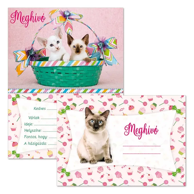 Ez 10 db-os partimeghívó szett tökéletes választás minden kis cicarajongónak, aki egy játékos és szerethető stílusban szeretné meghívni barátait szülinapi bulira vagy más eseményre. A meghívó elején egy bájos zöld kosárban kukucskáló kiscicák mosolyognak vissza, amit színes masnik és vidám cukorkás háttér díszít – garantáltan minden meghívott arcára mosolyt csal!