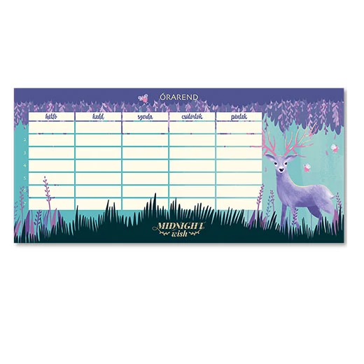 Ez a Midnight Wish elnevezésű órarend első sorban a kislányok tetszését fogja elnyerni köszönhetően a csajos színének és a szarvas mintás díszítésének, ami garantáltan feldobja a gyerekek tolltartóját. Az Ars Una órarend egyetlen lapból áll, de két oldalas kialakítást kapott, így A és B hetet is tudsz rajta jelölni. Az órarend magyar nyelvű, 250g-os félfényes műnyomópapírból van, melynek csodásak a színei és tollal valamint ceruzával is tudsz majd írni rá. Az órarend belefér a legtöbb tolltartóba is, hogy mindig kéznél és szem előtt legyen.