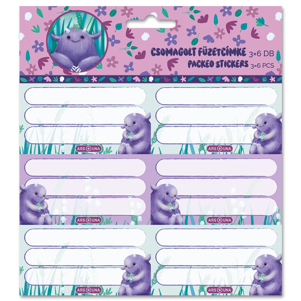 A dizájn igazán bájos, vidám, természetközeli hangulatot áraszt. A címkéken egy kedves, lila színű, bolyhos kis lény látható, amely egy növényt majszol, körülötte pedig fű és vadvirágok teszik teljessé a kompozíciót. A színvilág visszafogott, de mégis játékos, így kifejezetten tetszhet az alsó tagozatos gyerekeknek, különösen azoknak, akik szeretik az aranyos, mesés illusztrációkat. A címkék háttere világos, így a ráírt név és tantárgy jól olvasható marad, ami segít elkerülni a füzetek összecserélését az iskolában.