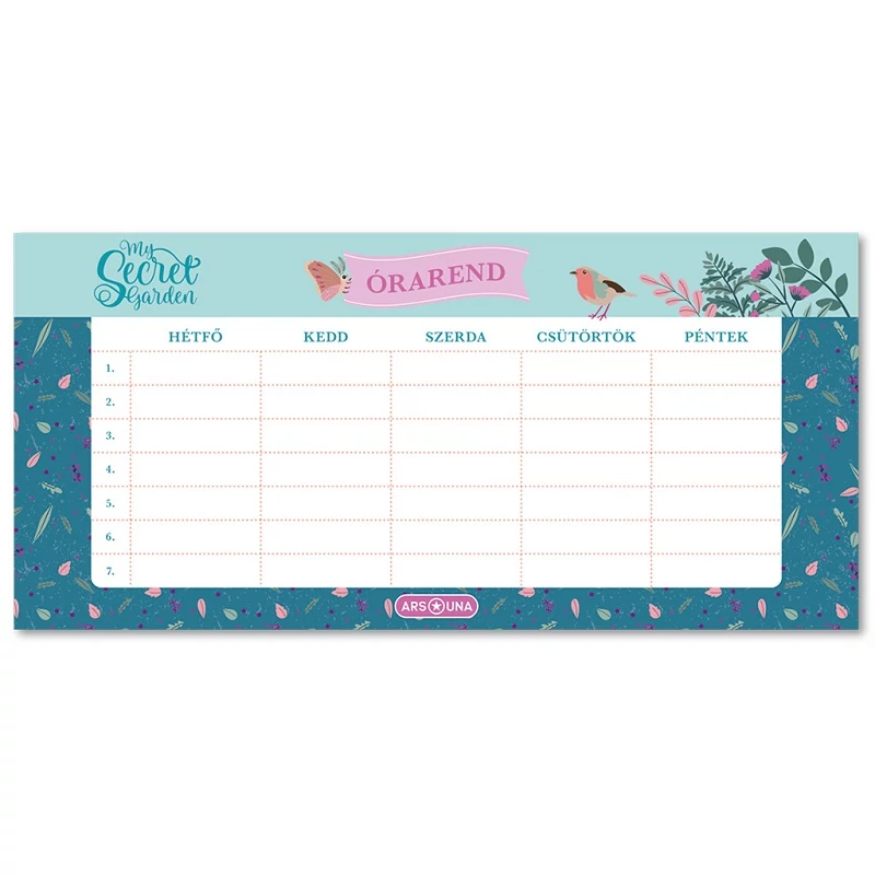 Ismerd meg az Ars Una My Secret Garden órarendjét, ami egy gyönyörű és stílusos kiegészítő minden természetkedvelő lány számára. Ez az órarend kék alapon virágos és leveles mintával van díszítve, így nemcsak praktikus, hanem inspiráló és nyugtató hangulatot is áraszt, mintha egy titkos kertben sétálnál.