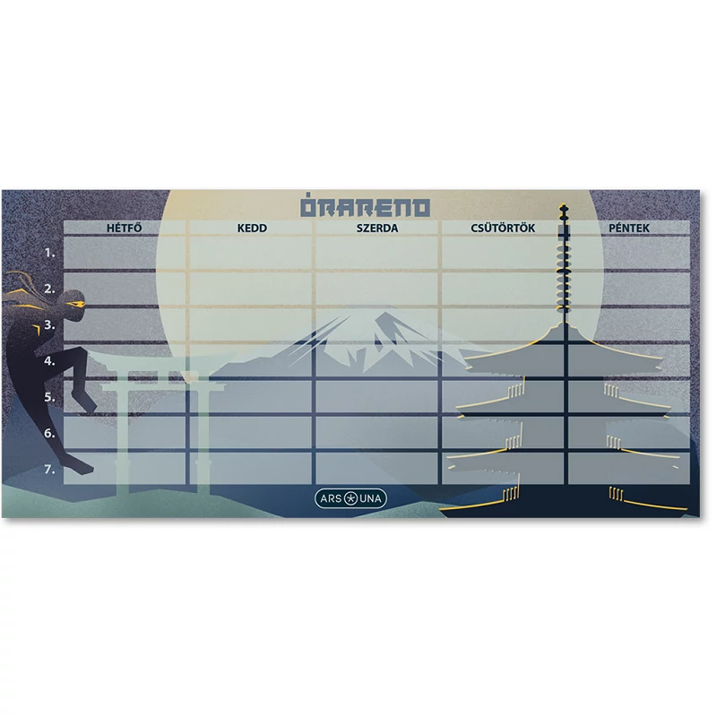 A japán harcművészetek és titokzatos világ rajongóinak készült az Ars Una Ninjas in the Dark órarend, amely különleges hangulatot visz az iskolai hétköznapokba. A háttérben egy hatalmas telihold emelkedik a hegyek fölé, miközben bal oldalon egy árnyékban megbúvó ninja figyeli a torii kaput, jobb oldalon pedig egy lenyűgöző pagoda teszi teljessé a keleties atmoszférát.