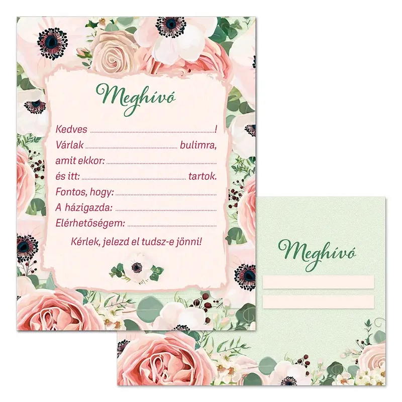 Ez a rózsa mintás partimeghívó igazi eleganciát sugároz, és tökéletes választás lehet egy különleges esemény, például szülinapi zsúr, keresztelő vagy akár egy baráti összejövetel stílusos bejelentésére. A meghívó díszítését pasztell árnyalatú rózsák, pipacsok és zöld levelek adják, finoman keretezve a középen elhelyezett szövegmezőt. A klasszikus, mégis bájos design minden korosztály szívét megdobogtatja.
