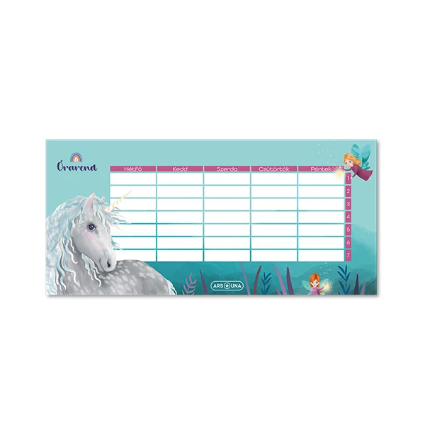 A kislányok imádni fogják ezt az órarendet, amely úgy színével mint a rá rajzolt motívumokkal nyeri el majd tetszésüket. A motívumok közé soroljuk az unikornist és a tündérkéket, amelyek a kicsik kedvence. Az Ars Una órarend egyetlen lapból áll, de két oldalas kialakítást kapott, így A és B hetet is tudsz rajta jelölni. Az órarend magyar nyelvű, 250g-os félfényes műnyomó papírból van, melynek csodásak a színei és tollal valamint ceruzával is tudsz majd írni rá. Az órarend belefér a legtöbb tolltartóba is, hogy mindig kéznél és szem előtt legyen.
