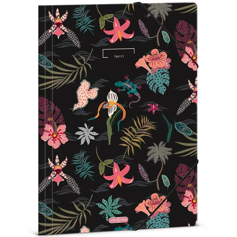 Tedd különlegessé gyermeked iskolai eszközeit vagy a saját irodai kellékeidet a Tahiti virágos gumis mappával! Ez az A/4-es méretű (240x330 mm) praktikus és stílusos mappa trópusi hangulatot idéző mintával készült. A fekete alapon elhelyezkedő színes virágok, levelek, pálmák és kis gekkók igazi egzotikus hangulatot teremtenek, így minden alkalommal öröm lesz elővenni ezt a mappát. Ideális iratok, dolgozatok, rajzlapok, jegyzetek és füzetek rendszerezett és biztonságos tárolására, akár iskolában, akár otthon vagy irodában.