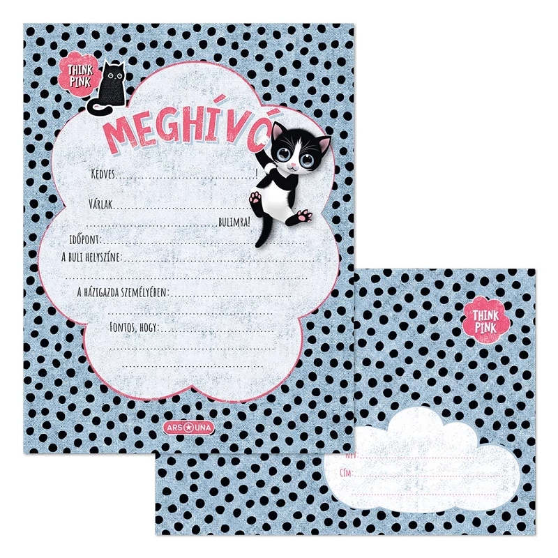 Az Ars Una Think Pink partimeghívó szett az Ars Una Think Pink kollekciónak egy része. A meghívók pöttyös alapon aranyos cicákat ábrázolnak, amelyek csajos és egyedi hangulatot kölcsönöznek. Ez a készlet tökéletes választás lehet, ha vidám és csajos meghívókat szeretnél küldeni különböző alkalmakra. A szettben 10 db különböző alkalomra használható partimeghívó lap található. Ezek a meghívó lapok pöttyös alapon aranyos cicákat ábrázolnak, amelyek vidámságot és egyediséget sugallnak. A meghívók kellemes hangulatot közvetítenek, és alkalmasak különböző események meghívására. A csomagban továbbá 10 db C/6 méretű boríték is található, amelyek az meghívókhoz illő mintával rendelkeznek. Ezek a borítékok megfelelnek a postai szabványnak, így könnyedén elküldheted a meghívókat. A partimeghívók 80 gr-os, szép fehér ofszet papírra készültek, és négy szín nyomással díszítettek. Ez lehetővé teszi számodra, hogy golyóstollal és filccel írj rájuk, és személyre szabott üzenetet küldj. A meghívók felakaszthatók, és négy színnel nyomott fejléccel vannak ellátva, amelyek még egyedibbé teszik őket.