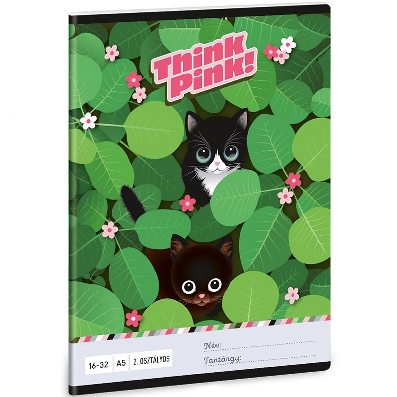 A Think Pink A/5 2. osztályos vonalas füzet tökéletes választás minden kisállatbarát és természetkedvelő kisiskolásnak, aki szereti a vidám, játékos mintákat. A borítón két cuki kiscica les ki a sűrű, zöld levelek közül, melyeket apró rózsaszín virágok díszítenek. A bájos dizájn barátságos hangulatot áraszt, és garantáltan mosolyt csal gyermeked arcára minden alkalommal, amikor előveszi a füzetét az iskolában vagy otthon.