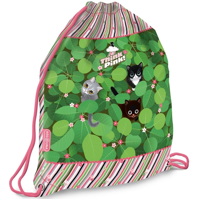 A Think Pink cicás tornazsák minden állatbarát kislány kedvence lesz! Vidám, zöld levélrengetegből kikandikáló három cuki cica mosolyt csal minden gyermek arcára, miközben játékos színvilága – a rózsaszín csíkok és virágos díszítés – még különlegesebbé teszi a megjelenését. Ez a sportzsák nemcsak bájos, hanem rendkívül praktikus is.