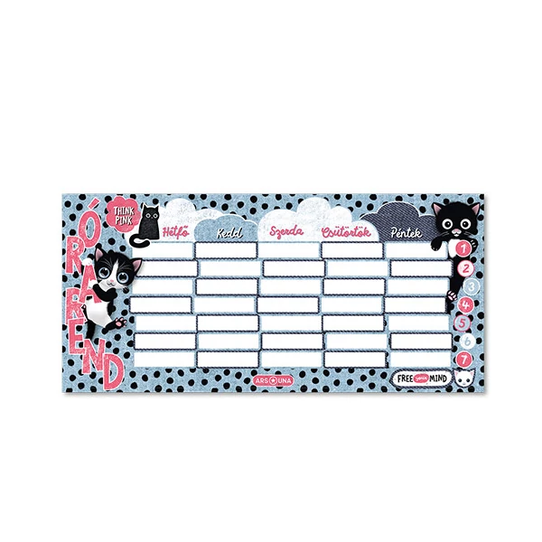 Egy kétoldalas órarenddel bővítheted ki gyermeked iskolaszerét, amely A és B hét beosztással rendelkezik, így könnyen követhető a heti órarendváltás. Az órarend 250 gr-os félfényes műnyomó papírra van nyomtatva, 4 színes nyomástechnológiával, ami élénk és tiszta színeket eredményez. A Think Pink órarend a cicákról szól, ugyanis kis állatok vannak a felületére rajzolva, amelyek még vonzóbbá teszik a gyerekek számára. Ezen kívül a dizájn is eléggé érdekes, és minden szín, motívum passzol rajta. Az órarend mérete 232 x 109 mm, amely ideális méret az iskolai táska vagy az otthoni íróasztal számára. Az órarend mind praktikus, mind esztétikus, ami nagyszerű kiegészítője a tanévnek.