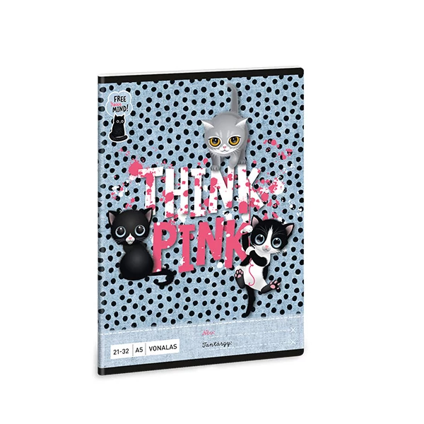 Minden kislány szeretne olyan füzeteket, amelyek borítóját valamilyen érdekes minta díszítene, hiszen az ilyenekért odavannak. A Think Pink füzet borítójára 3 cica is fel lett festve, amelyek nagy szemükkel elvarázsolják a gyerekeket és könnyedén összebarátkoznak. Ez a vonalas füzet ideális választás, hiszen a belső lapokat egy keményebb fedlap védi, ami a mintázat mellett előre kialakított résszel is rendelkezik, ahova a név és a tantárgy is felkerülhet, így füzetcímkére sincs szükség. A termék sarkait lekerekítették, így téve lehetővé azt, hogy a gyűrődésektől és a szamárfülektől leginkább védve legyen.