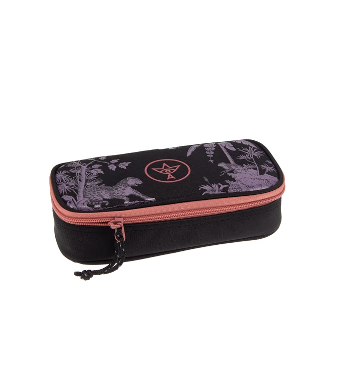A Trópusi dzsungel mintázattal ellátott tolltartó fekete alapszínnel és barack színű cipzárral rendelkezik amely igazán divatos megjelenést kölcsönözhet használója számára az iskolai mindennapok során. A 100% poliészter anyagnak köszönhetően igazán strapabíró és vízlepergető hatású, amelynek nehezen koszolódik és könnyen tisztítható. A tolltartó 21cm-es hosszúságának köszönhetően akár egy vonalzó, körző is kényelmesen elférhet benne a további írószerek mellett.
