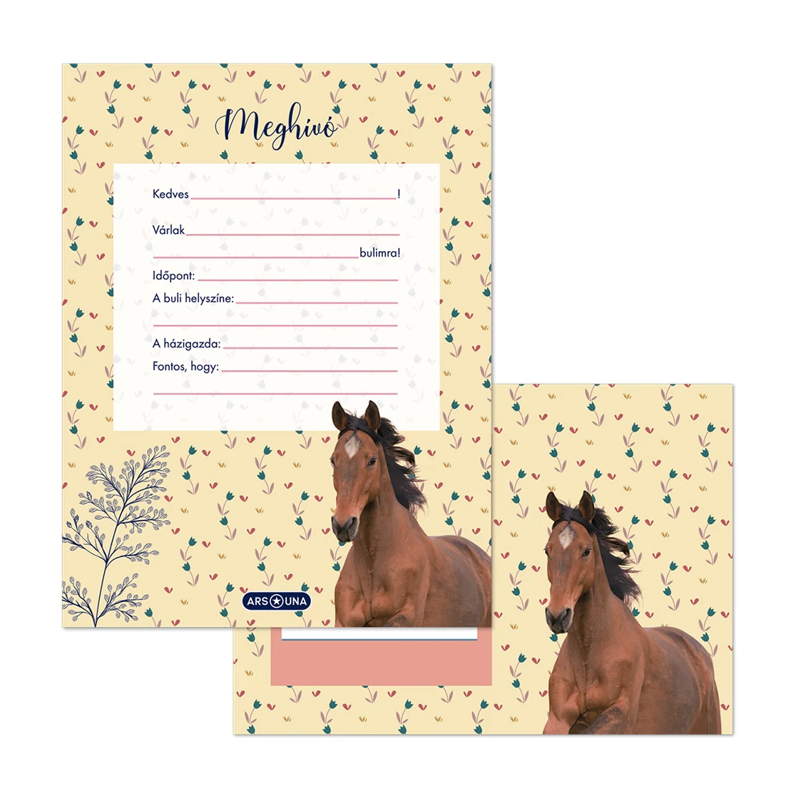 A meghívók stílusa könnyed és természetközeli, ami ideális választás lehet kerti partikhoz, lovas eseményekhez vagy más természettel kapcsolatos összejövetelekhez. A virágos motívumok és a sárga alap színe vidám és barátságos hangulatot árasztanak, míg a barna ló a lovas témához ad egy egyedi és bájos érintést.
