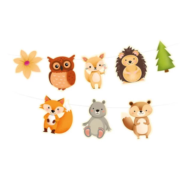 Aranyos süni, róka, maci, bagoly, mókus és nyuszi formájú dekoráció mosolyog vissza a gyerkőcökre. Rendezz egy vidám hangulatú gyerekpartit ahol ezek az aranyos erdei állatok díszítik a helyiséget. Nagyon látványosak a 13-18 cm magas erdei állatok, fenyőfa és virág formájú papír elemek amiket a csomagban található 5 m hosszú fehér szalagra kell, hogy felfűzzél. Az elkészült 2 m hosszú dekoráció két végét rögzítsd a kiszemelt helyre, anyagának köszönhetően többször is használhatod. Az erdei állatok témájú szülinap vagy gyerekzsúr dekorációjához szerezd be a kollekció további kellékeit mint pl. erdei állatok party pohár, tányér, szalvéta és erdei állatos lufi. Így lesz teljes és emlékezetes az erdei állatos parti dekorációja.