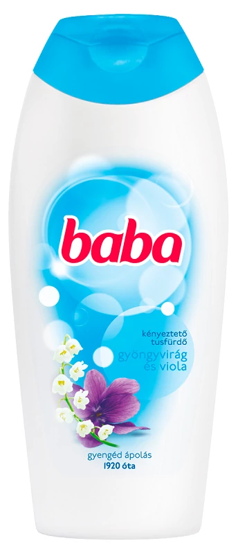 A Baba gyöngyvirág és viola tusfürdő gyengéden ápolja a bőrt, miközben nyugtatólag hat a testre és a lélekre egyaránt. Fürdésre és kézmosásra is használható. A virágok nyelvén a gyöngyvirág a boldogsághoz való visszatérést szimbolizálja. Ha vetünk egy pillantást a kis fehér csengettyűire, máris halljuk a zeneszót és érezzük a magával ragadó finom, virágos illatot. Ez a tusfürdő viola illatával megbolondítva igazán különleges gyöngyszem a tusfürdők között. Az ikonikus kék-fehér pöttyös Baba 1920 óta nyújt gyengéd ápolást a magyar családoknak a mindennapokban. Jól ismert összetevőivel és illataival a Baba igazán okos választás, a család összes tagja számára megfelelő. Minden a méltán híres Lanolinos szappannal indult, mára viszont kibővült termékválasztékkal fedi le a különböző igényeket: habfürdő, sampon, testápoló, szappan, folyékony szappan, és dezodor formájában.