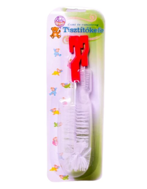 Felakasztható cumisüvegmosó kefe. Csúszásmentes fogást biztosít a kefe nyele. A termékhez tartozó kisebb kefe hatékonyan tisztítja az etetőcumikat.
