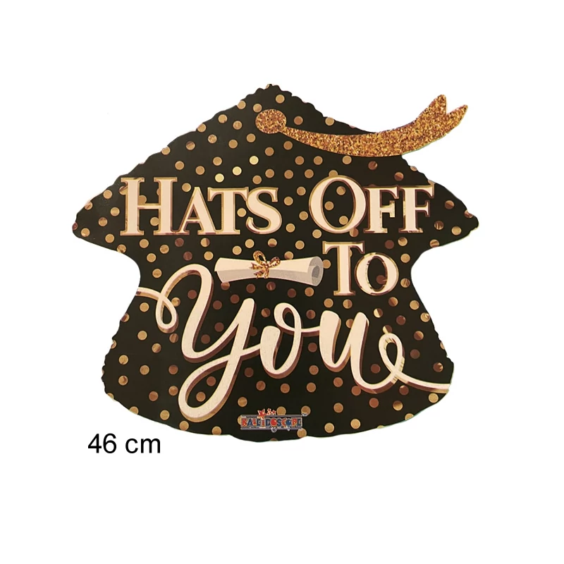 Ballagási fólia lufi Hats Off to You felirattal 46 cm-es méretben kalap formában.