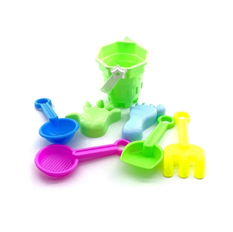 A szett tartalma: 1 db vödör, 1 db kanál, 2 db homokozó forma, 1 db gereblye, 1 db szitás kanál és 1 db lapát.