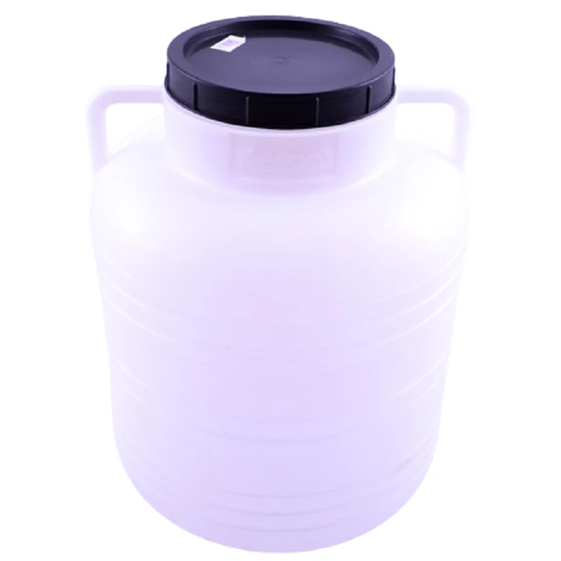 Bőszájú műanyag hordó menetes fedővel és fröccsentett emelőfüllel. Alkalmazható a zárt tárolásra és cefrézéshez.