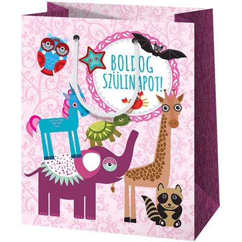 A gyerekek születésnapjára nem készülhetünk ajándék nélkül, és a csomagolás gondoskodik a meglepetésről, ugyanakkor ha a csomagolás terén nem vagyunk túl profik, akkor ez a mókás, állatos mintával díszített ajándéktáska remek választás lehet. A gigant méretű, fekvő kialakítású ajándéktáska kiváló minőségű, telített színekkel készített nyomata szép megjelenést, míg a lakkozott vastag papír és az erős zsinórfüles kialakítás tartósságot kölcsönöz neki, hogy a benne lévő ajándékok biztonságban legyenek.