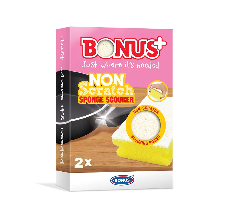 Az egy darabos kiszerelésű Bonus Karcmentes szivaccsal erős, de mégis kíméletes súroló hatás érhető el mosogatás közben vagy bármely más háztartási felület tisztítása során. A karcmentes fehér dörzsiréteg nem sérti fel az érzékeny felületeket, így lehetővé teszi mindenféle felület tisztítását. Használat közben a szivacs oldalain elhelyezett vájatok kényelmes fogást biztosítanak.