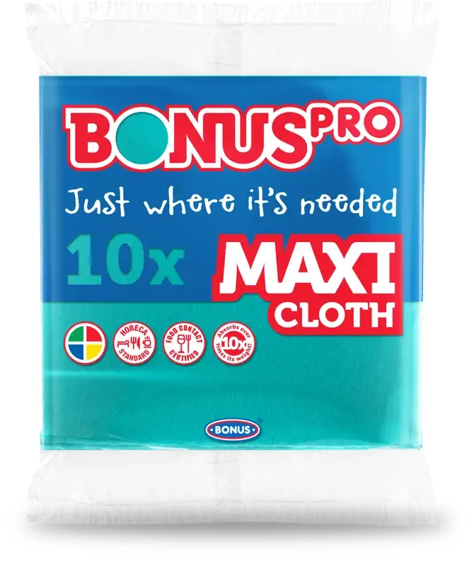 A BONUSPRO MAXI törlőkendőt maximálisan a HoReCa szegmens igényeinek megfelelően alakítottuk ki. Mérete 38X40cm, így hatásosan tisztítja a nagyobb felületeket, legyen szó pultokról, polcokról, állványokról vagy más tisztítandó területről. A professzionális felhasználók – éttermek, hotelek, étkeztetők, kórházak, közintézmények – számára minden igényt kielégítő általános törlőkendő kiemelkedő nedvszívó képességgel rendelkezik.