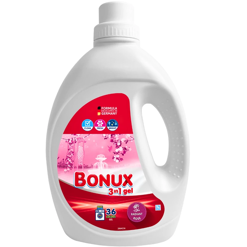 3 az 1-ben folyékony automata mosószer rózsa illattal színes ruhaneműkhöz - Bonux 3 az 1 Colors Gel Radiant Rose, 2700 ml: automata folyékony mosószer színes ruhákhoz. Mélyen tisztít, és friss és finom magnólia illatot biztosít. Emellett intenzív, élénk és fényes színeket biztosít a frissen mosott ruhákhoz. Természet ihlette parfümöket tartalmaz, amelyek akár 14 napos frissességet biztosítanak a ruhaneműnek.