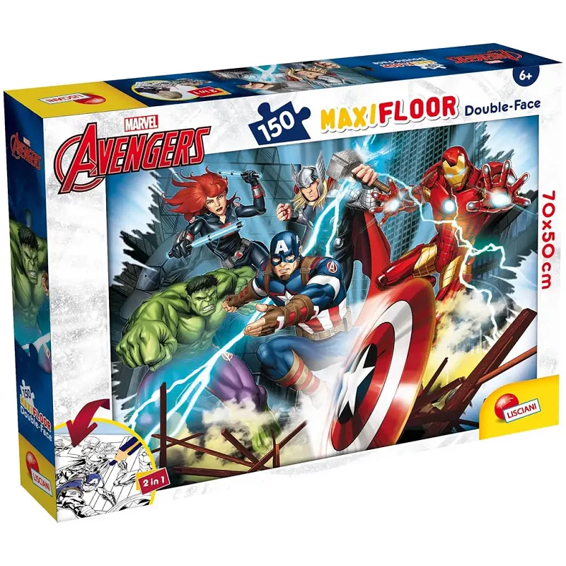 Keltsd életre a Marvel-univerzum legnagyobb hőseit otthon a padlón! A Bosszúállók 2 az 1-ben 150 db-os maxi puzzle és színező a Lisciani-tól egy olyan kreatív és fejlesztő játék, ami hosszú időre leköti a 6 évesnél idősebb gyerekeket. A doboz egy dupla élményt rejt: az egyik oldalon egy izgalmas, színes puzzle jelenik meg, amelyen Hulk, Amerika Kapitány, Thor, Vasember és Fekete Özvegy harcba szállnak egy város romjai között. A másik oldal pedig egy részletesen megrajzolt, fekete-fehér színező, amelyet a gyerekek saját fantáziájuk szerint festhetnek ki.